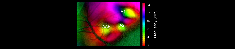 A tonotopic map, looking down on the surface of auditory cortex, obtained with calcium imaging in transgenic mice expressing GCaMP6.
